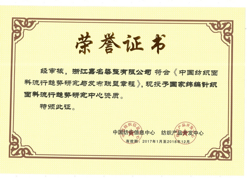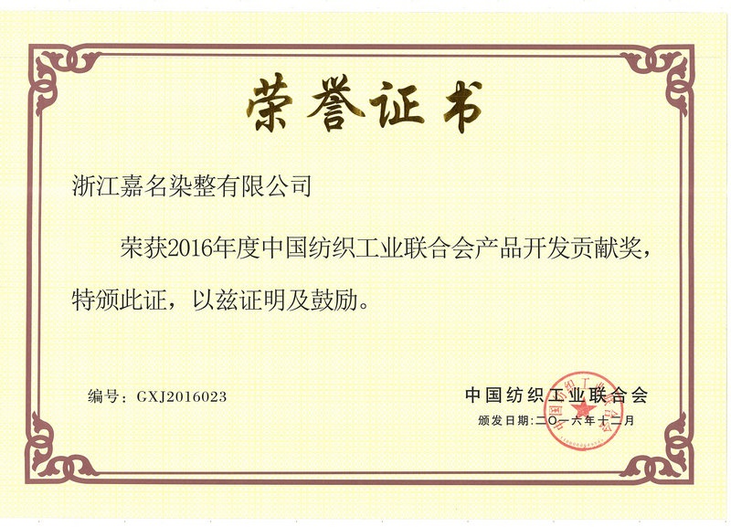 在中國紡織創新年會上,中國紡織工業聯合會授予“嘉名染整”“2016年度中國紡織工業聯合會產品開發貢獻獎”;中國紡織信息中心、紡織產品開發中心授予“嘉名染整”“國家緯編針織面料流行趨勢研究中心資質”