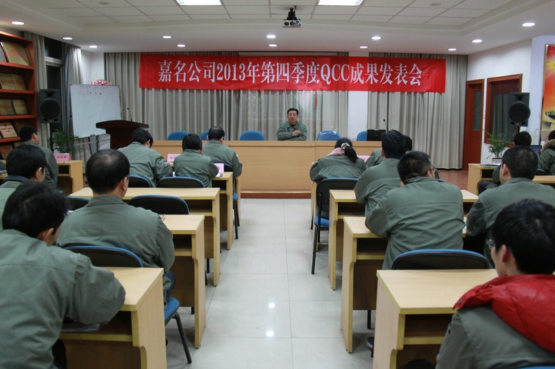 2014年1月13日晚,嘉名公司2013年第四季度(第三屆)QCC成果發表會召開,會上共發表QCC成果20項,經評委評選,動力設備部福生組的《降低空壓機用電量》等8個QCC成果評為優秀獎,紡織事業部運轉組的《如何降低氨綸汗布的反氨綸》等12個QCC成果評為鼓勵獎。