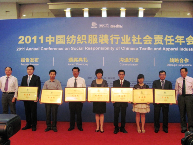會議期間,中國紡織工業協會發布了“2010-2011中國紡織服裝行業社會責任報告”,16家紡織服裝企業同時發布了企業的2010年度社會責任報告。我公司發布的《2010年度社會責任報告》獲得了協會頒發的“2011年度中國紡織服裝行業社會責任信息披露實踐優秀獎”。莫總在發表獲獎感言時表示:在堅持“為顧客創造價值、為企業增創效益、為員工謀求發展、為社會多做貢獻”的企業核心價值觀指導下,我們將繼續努力,為紡織行業的發展做出新的貢獻!